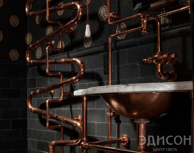 ...Пример интерьера в стиле стимпанк....Ванная комната в стиле стимпанк. Признаком классического стимпанк считается подсветка, имитирующая рассеянный свет с желтоватым оттенком, исходящий от газовых светильников. Добиться подобного эффекта помогают газоразрядные лампы Эдисона, которые представлены в ассортименте магазинов нашей сети. Современные трактовки данного стиля позволяют использовать и другие осветительные приборы, вплоть до светодиодов, главное – сохранить нужную атмосферу таинственности и загадочности. Стиль стимпанк позволяет воспроизвести в интерьере два основных дизайнерских тренда 2015 года: экологичность во всем и вторую жизнь старых вещей.