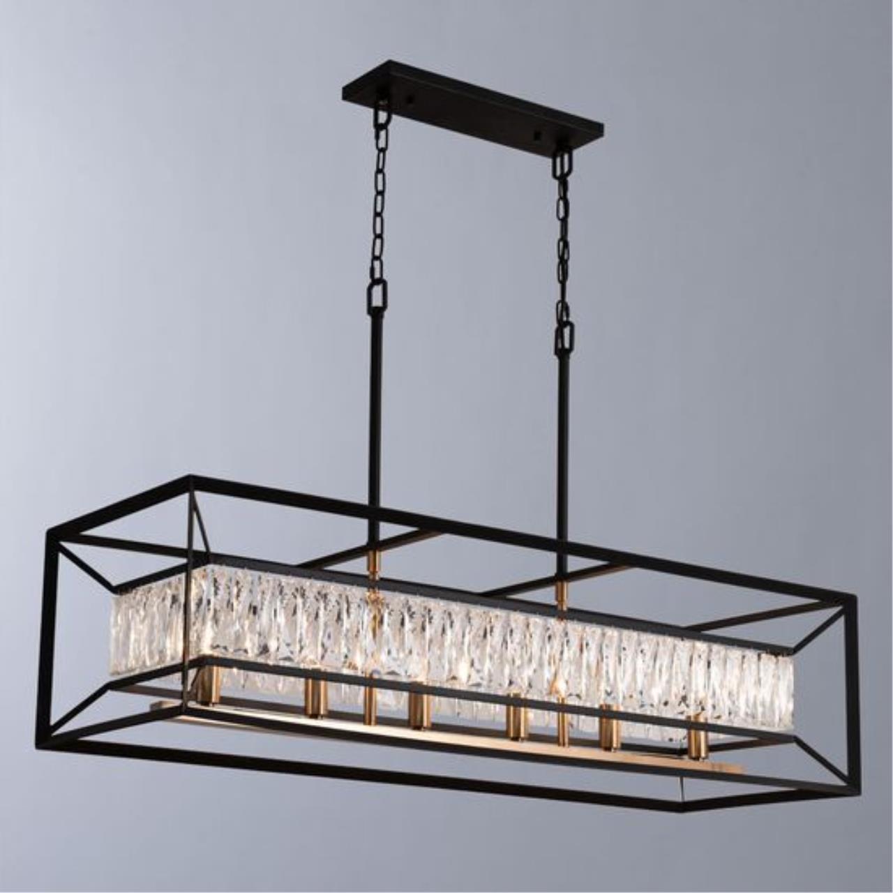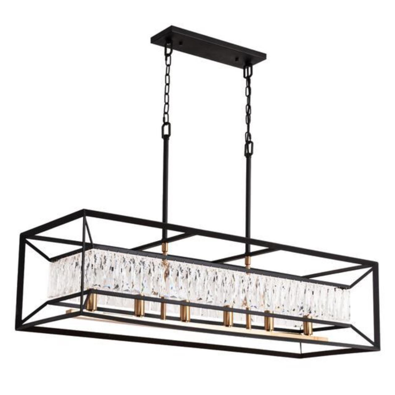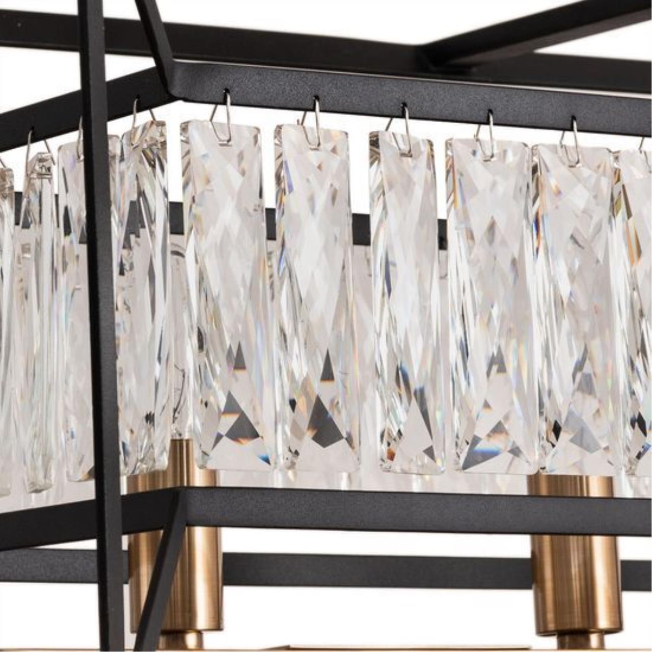 Яркий дизайн Люстраов Frost объединяет в себе нотки классики и стиля Loft. Массивное металлическое основание в сочетании с прозрачным многогранным хрустальным стеклом подчеркнуто модной цветовой гаммой, черный и латунь. Декоративные хрустальные элементы современной формы со множеством граней выполняют функцию плафонов. Они мягко рассеивают и отражают свет, создавая множество переливов и бликов. Коллекция представлена Люстраами различной формы и размеров, что позволяет создать единую световую композицию в интерьере. Подвесы круглой и вытянутой формы будут шикарно смотреться над большими столами в гостиной.