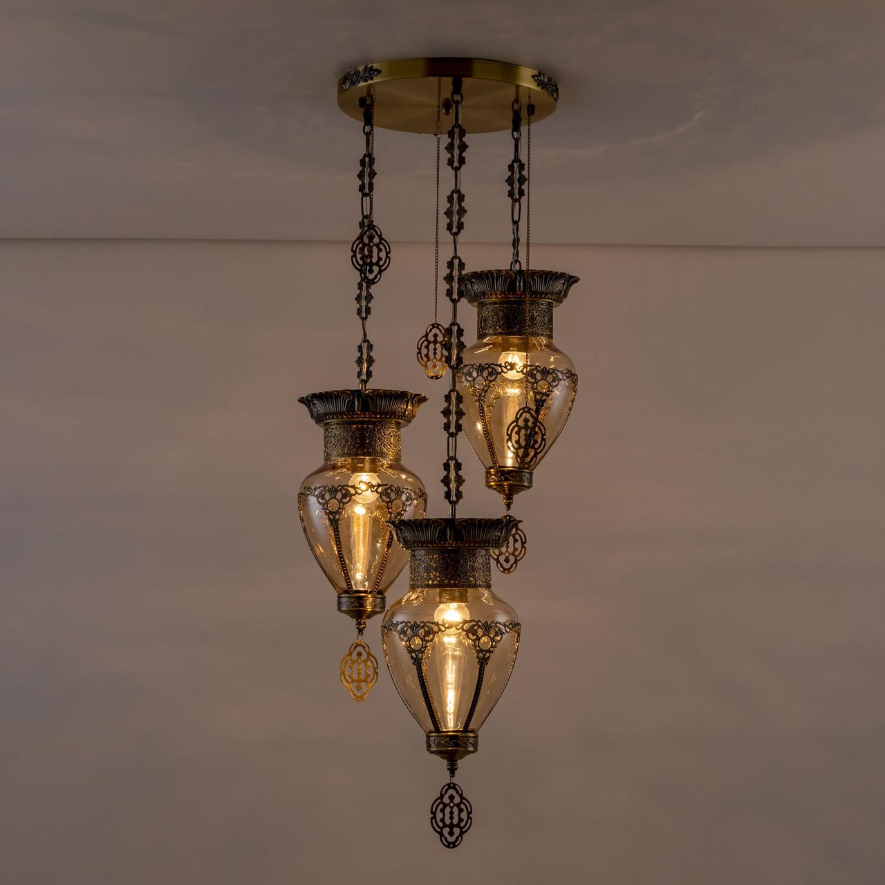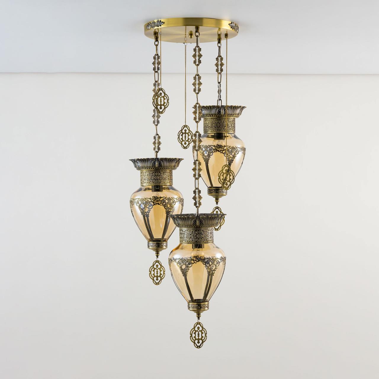 Восточный каскадный светильник Citilux Каир CL419233 с тремя подвесными плафонами. Каркас металлический, цвет бронза. Плафоны оригинальной формы, изготовлены из прозрачного стекла медового оттенка, украшены декоративными, ажурными элементами. В изделии используются лампы с цоколем Е27, максимальной мощностью для ламп накаливания 75Вт. Светодиодные лампы можно устанавливать более яркие. Модель подходит для всех типов потолков, в том числе натяжных. Тип крепления – планка. Люстра Каир CL419233 прекрасный вариант для атмосферного освещения интерьеров квартир и загородных домов, выполненных в восточном стиле. Это великолепное решение при оформления уютных кафе, баров и ресторанов.