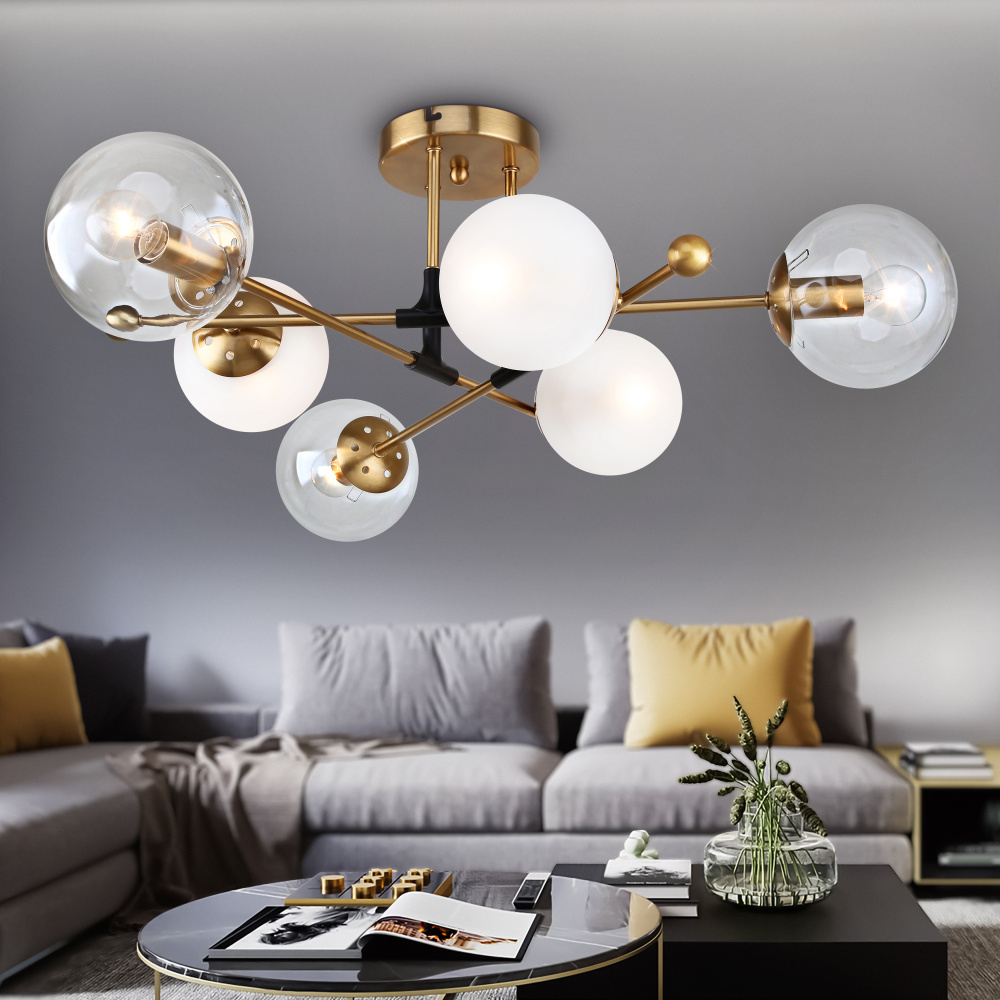 Люстра на штанге потолочная, латунного цвета, выполнена в стиле модерн. Люстра Rivoli Darlene (арт. 3145-306) – дизайнерская, её оформление создано в Италии в соответствии с самыми последними трендами дизайна интерьеров. Минималистичные латунные рожки люстры представлены в формате перекрёстных реек. 6 круглых плафонов изготовлены из разного стекла: 3 плафона – прозрачные, 3 плафона – матовые. Люстра потолочная латунная Rivoli Darlene применяется с лампами Е14 мощностью 40 Вт. При использовании всех источников света качественно осветит площадь до 18 м2.
