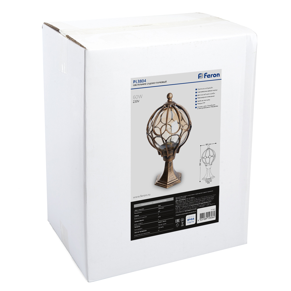 Светильник садово-парковый, серии «Версаль», (НТУ) FERON PL3704 60W, E27, 230V, IP44, цвет черное золото, шар, на постамент, 180*180*380мм