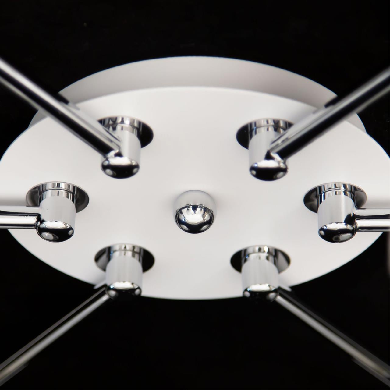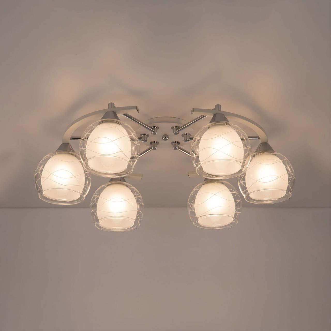 Потолочные светильники серии «Буги» выделяется интересным дизайном в стиле модерн. Люстры сделаны из легкого метала и интересными стеклянными двойными плафонами. Внешняя сторона плафона прозрачная с дизайнерским узором, а внутренняя полупрозрачная. За счёт полупрозрачного плафона свет в помещении получается очень яркий, равномерно рассеянный, но вместе с тем мягкий, приятный для зрения. Арматура модели на шесть рожков с завода в упаковке собрана и скоммутирована на двойной выключатель. Деление осуществлено 4х2, с одной клавиши будет включаться четыре плафона, со второй ещё два. Подключение произведено через один плафон. Люстры производятся в двух цветах: белый плюс хром, идеальное решение для нежных и светлых интерьеров, и алюминий плюс хром, который лучше сочетается с современными дизайнами. Арматура слегка вытянута, не идеальный круг. Такое конструктивное решение позволяет достигать хороших показателей освещённости по углам комнаты. Крепятся люстры под потолком тем самым они не занимают место и прекрасно подходят к помещениям с небольшой высотой потолка. Патроны выполнены из термостойких материалов, выдерживают лампы накаливания до 75 ватт включительно, а энергосберегающие, или светодиодные лампы можно использовать любой яркости, что позволит вам осветить большие площади. Площадь освещения моделей на четыре рожка до 21 квадратного метра.