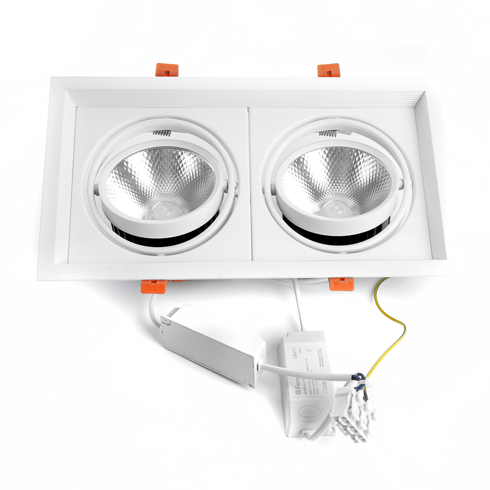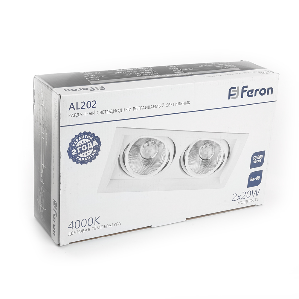 Светильник карданный встраиваемый светодиодный , карданный (ДВО) FERON AL202, 40W 4000К (белый), 170-265V, 3600Lm, IP20, угол рассеивания 35°, цвет белый, корпус алюминий, рассеиватель стекло, 315*175*80 мм, монтажн.отв. 295*155 мм.