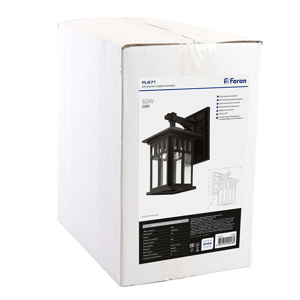 Светильник садово-парковый, серии «Бергамо», (НБУ) FERON PL671 60W, E27, 230V, IP44, цвет черный, прямоугольник, на стену вниз, 220*155*315мм