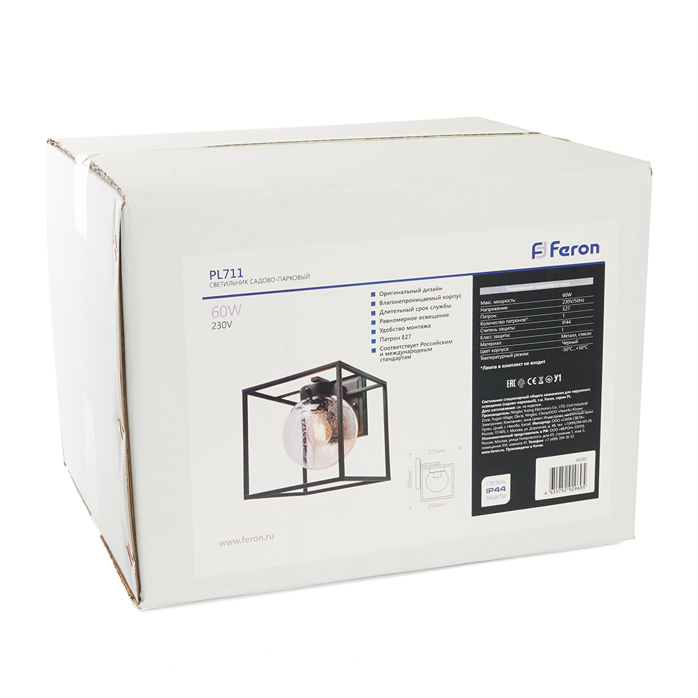 Светильник садово-парковый, серии «Прованс», (НБУ) FERON PL711 60W, E27, 230V, IP44, цвет черный, квадрат, на стену вниз, 275*250*290мм