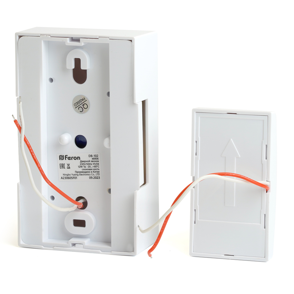 Звонок дверной проводной FERON DB-102, 1 мелодия, цвет белый, БАЗА: 230V, 119*70*37 мм, КНОПКА: IP20, размер кнопки 45*80*25мм