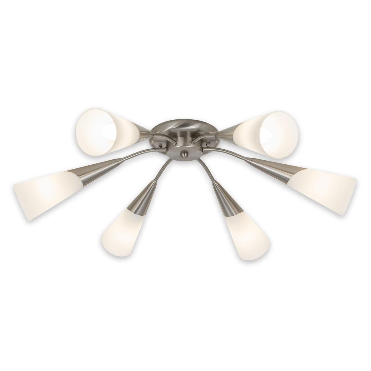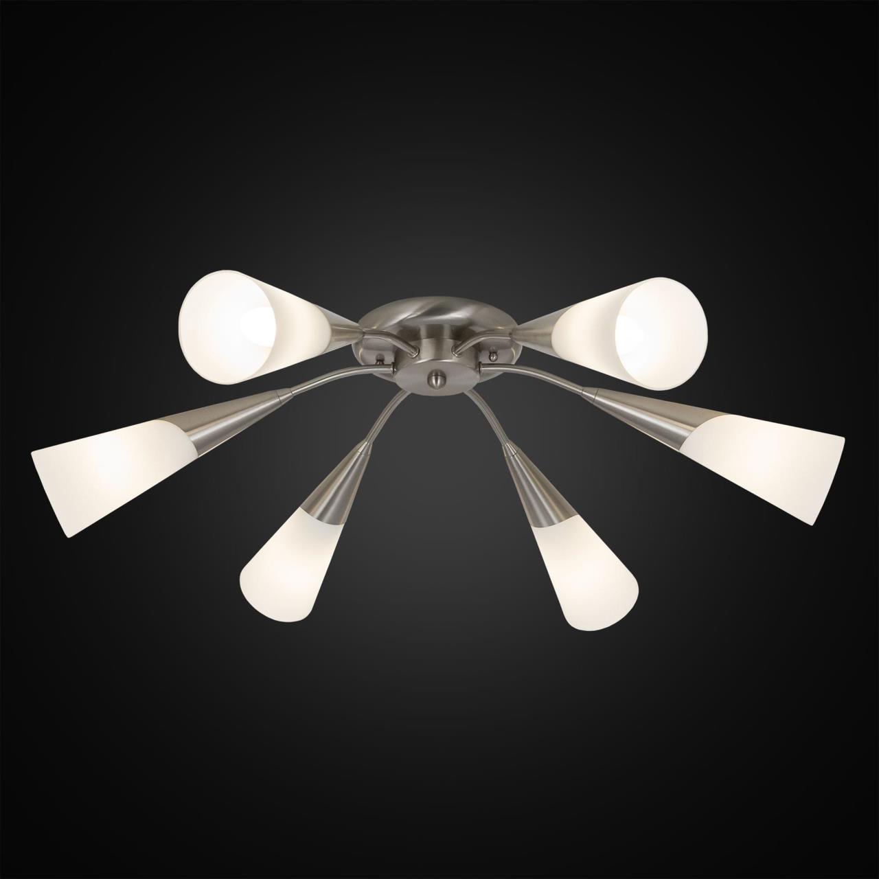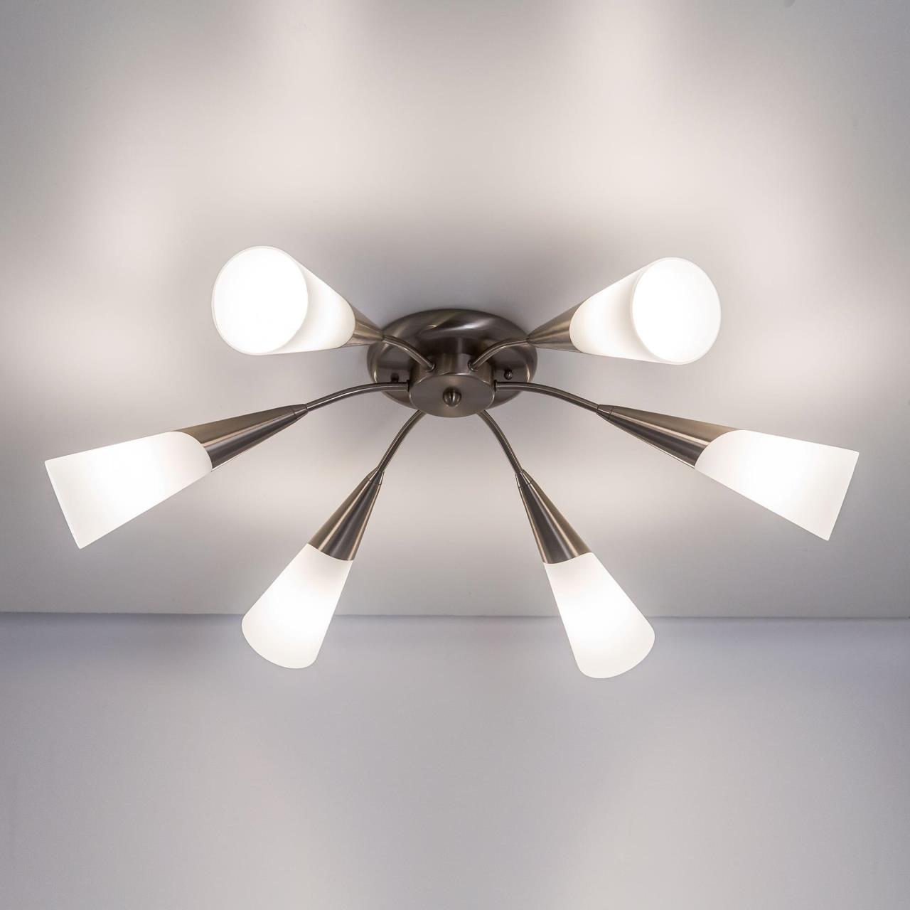 Стильные потолочные люстры серии Фокус от Citilux моментально нашли своих поклонников на рынке освещения в России Модели из коллекции Фокус прекрасно подойдут для различных помещений, таких как спальня, гостиная, спальня, прихожая. Компактные размеры и крепление непосредственно на потолок делает данный светильник замечательным выбором для помещения с невысокими потолками. Матовые, конусовидные, стеклянные плафоны прекрасно смотрятся в сочетании с никелированной поверхностью люстры, придавая ей свой неповторимый стиль. Плафоны светильника направлены в разные стороны, что позволяет равномерно освещать все пространство помещения. Модель на шесть рожков рекомендована нами на помещения площадью 11-17 квадратных метров. В люстре используются термостойкие качественные патроны, позволяющие применить лампы накаливания с цоколем Е14 до 60 Ваттт, также можно использовать светодиодные или энергосберегающие лампочки любой мощности. Технической особенностью люстры является возможность её подключения на двухклавишный выключатель. Конструкция подходит для любого типа потолка, в том числе и натяжного. В случае если вам удобнее крепить светильник на стационарный потолочный крюк, вы сможете приобрести у производителя специальный переходник для этих целей.