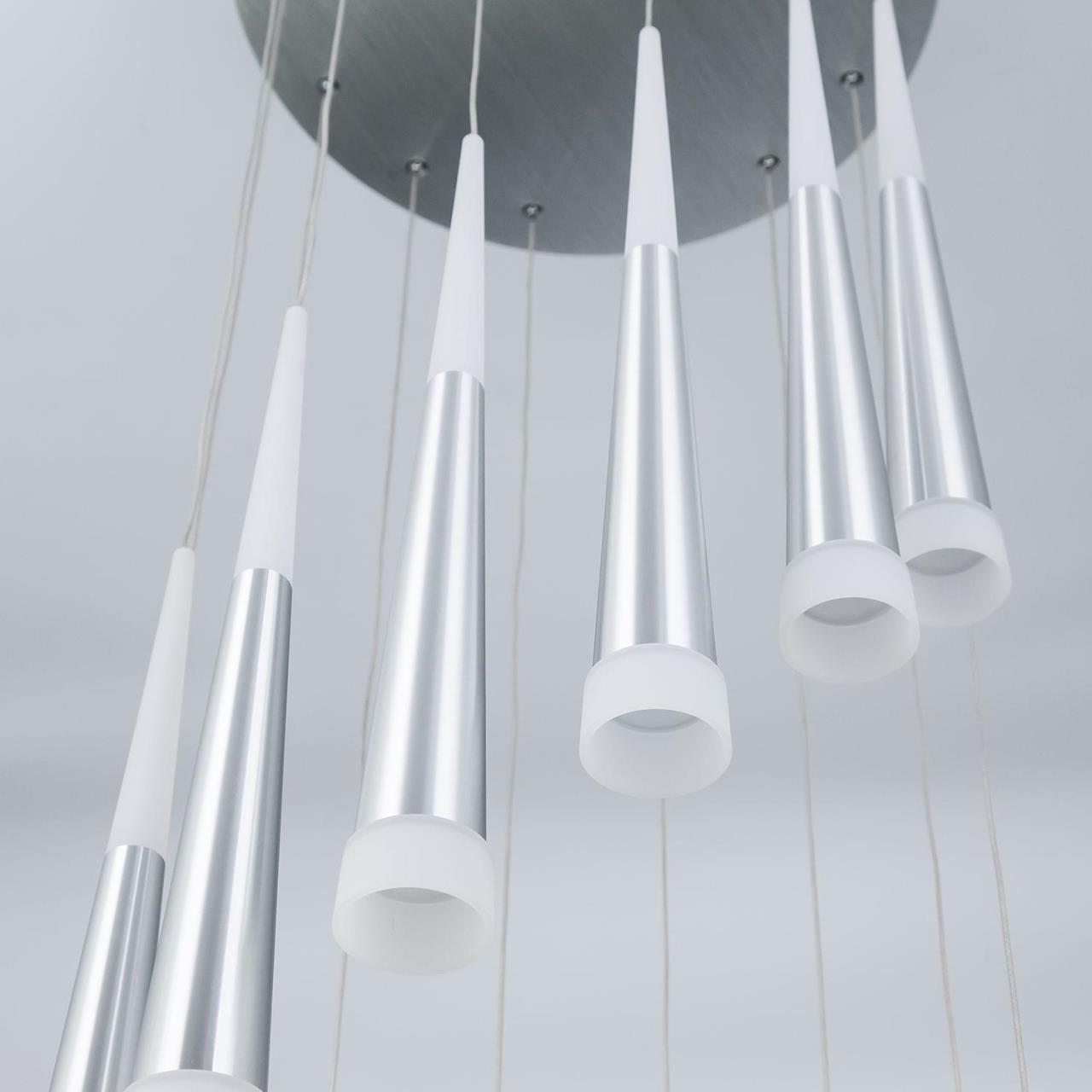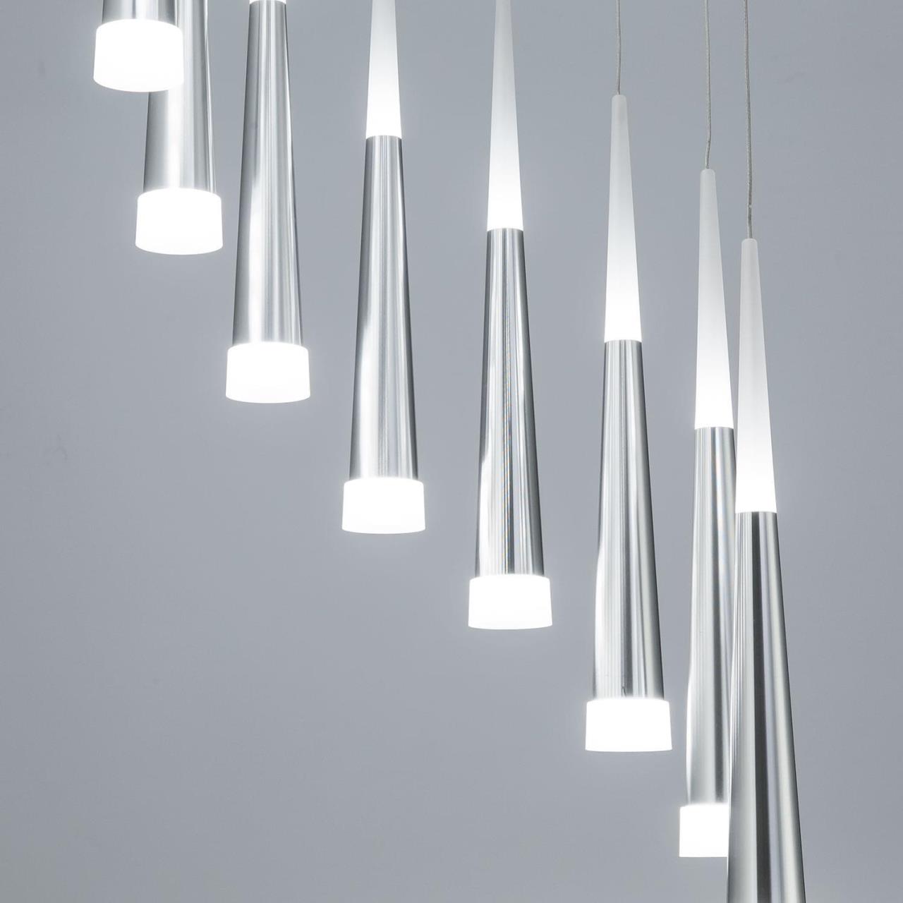 Все подвесы новой коллекции «Вегас» излучают оптимальный для человеческих глаз, мягкий тёплый (3000К) свет, и разработаны в нескольких вариантах размера, от аккуратных одинарных до огромных и шикарных шеснадцатирожковых. Мощность каждого рожка в диодном эквиваленте 7 Вт, что соответствует приблизительно шестидесяти ваттной лампе накаливания. Данная модель люстры, с 14-ю плафонами, способна осветить помещение площадью от 21 до 34 квадратных метров! Внутри плафона подвеса стоят современные светодиоды, которые дают яркий и в тоже время рассеянный свет. Высота каждого элемента подвеса независимо регулируется, позволяя придавать светильнику индивидуальный дизайн.