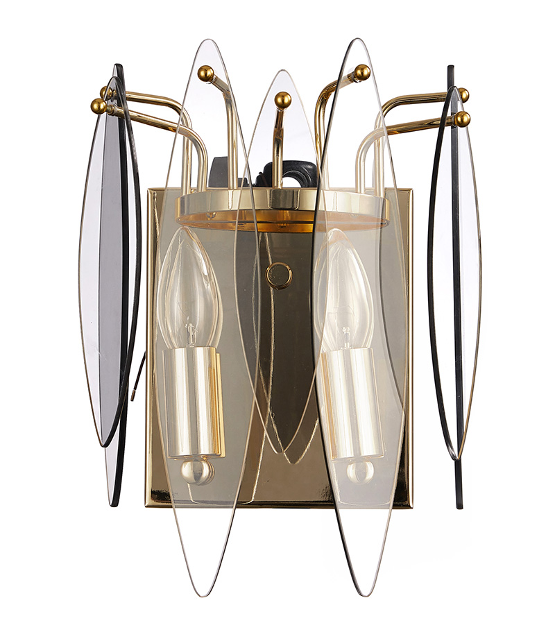 Настенное бра из серии Merkel имеет металлическую арматуру, гальванизированную в цвет золота и декорировано полупрозрачным стеклом в форме линзы, гальванизированным в дымчатый цвет.