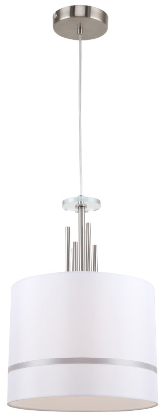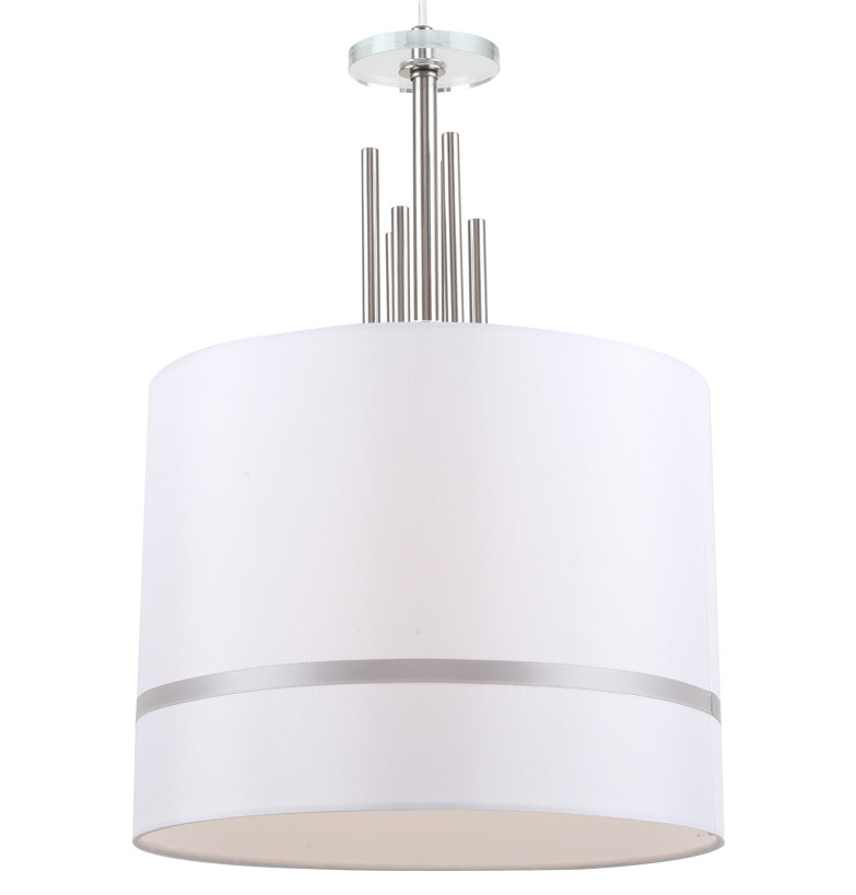 Подвесной светильник из серии Chart имеет металлическую арматуру, гальванизированную в цвет никеля и декорирован железными стержнями в цвет арматуры. Текстильный абажур белого цвета с термостойким акрилом внутри отделан кантом в цвет арматуры. Декоративная розетка выполнена из прозрачного стекла.