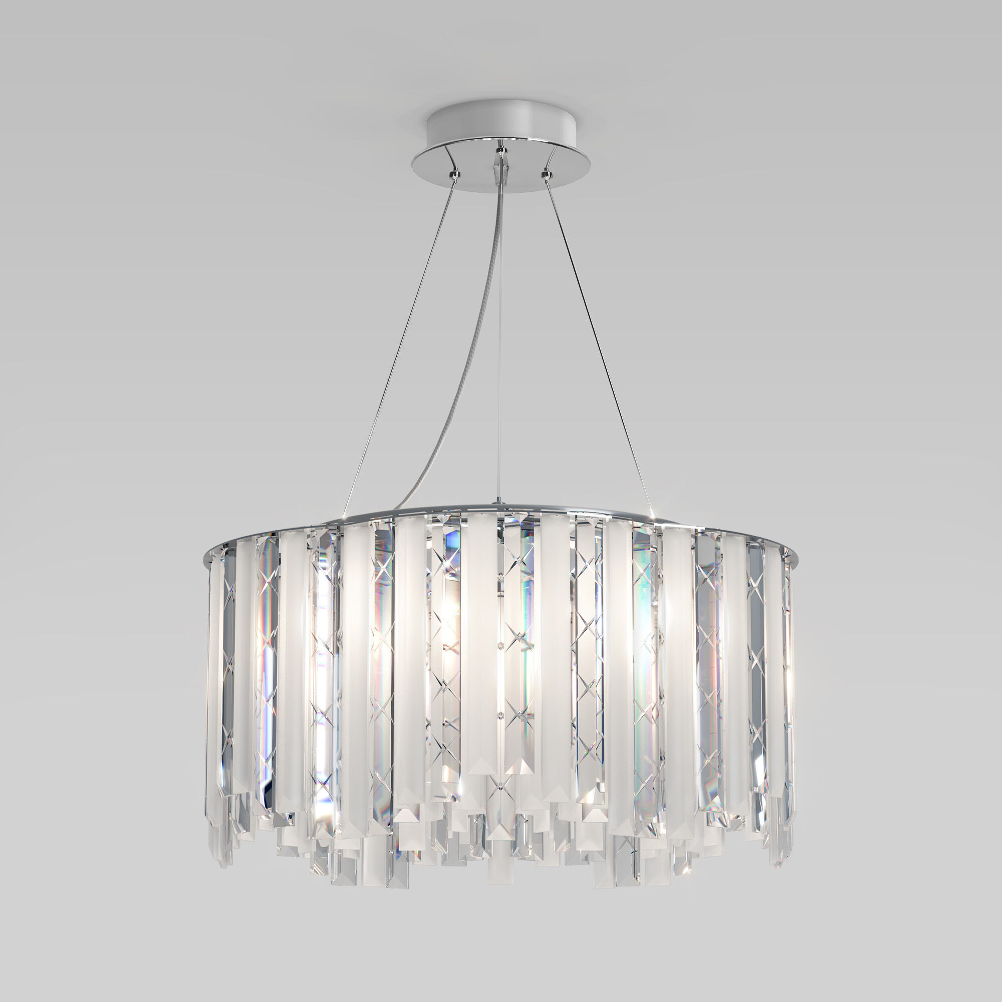 Декоративные хрустальные элементы переливаются на свету искристыми завораживающими бликами благодаря лампам с цоколем E14. В производстве подвесной люстры использовали хрусталь и высококачественный металл с надежным защитным покрытием.