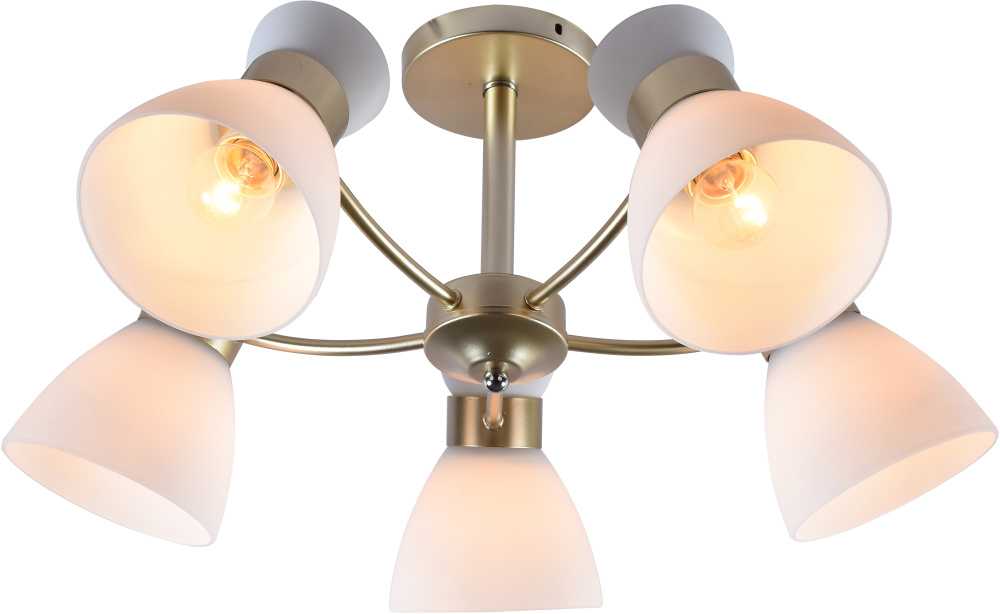 Серия золотых светильников с опаловыми плафонами — практичное и стильное решение в духе современной классики. В коллекции люстры на 5 и 8 ламп, а также бра с удобным выключателем-цепочкой. Подходят лампы с цоколем E27, мощностью до 60 Вт (лампы в комплект не входят).