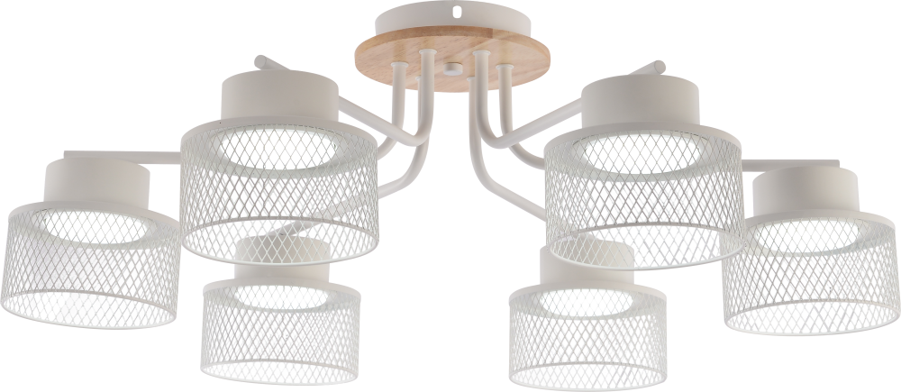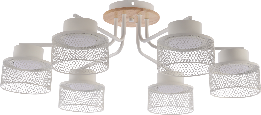 Коллекция белых светильников с цоколем GX53 (мощность 15Вт) — стильное сочетание современного дизайна и природной текстуры. Сетчатые плафоны создают яркое освещение, а элементы натурального дерева добавляют уюта в атмосферу интерьера. Серия представлена светильниками на 6 и 8 рожков и бра с встроенным выключателем.