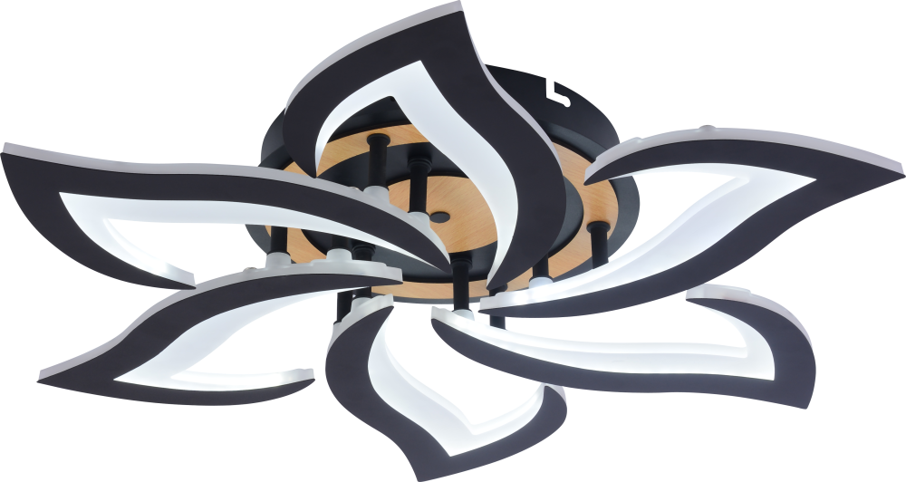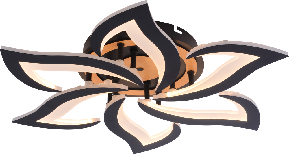Серия черных светодиодных потолочных светильников с элементами натурального дерева включает модели мощностью 42 и 84 Вт. В комплекте пульт ДУ для удобного регулирования яркости и цветовой температуры от 3000 до 6250 К, позволяя настроить освещение под любые потребности и атмосферу.