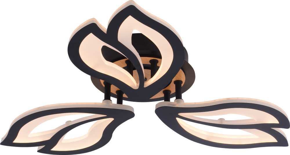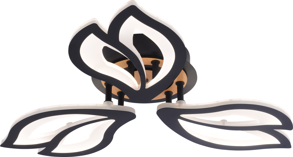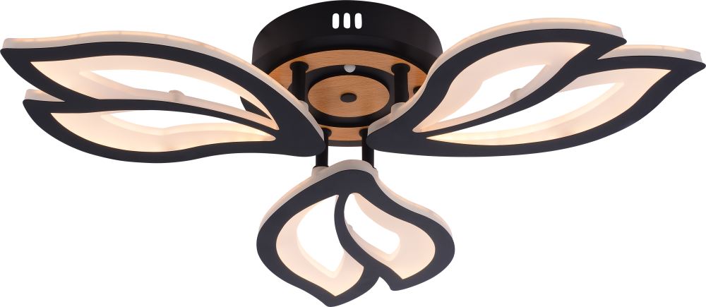 Серия черных светодиодных потолочных светильников с элементами натурального дерева включает модели мощностью 60 и 100 Вт. В комплекте пульт ДУ для удобного регулирования яркости и цветовой температуры от 3000 до 6250 К, позволяя настроить освещение под любые потребности и атмосферу.