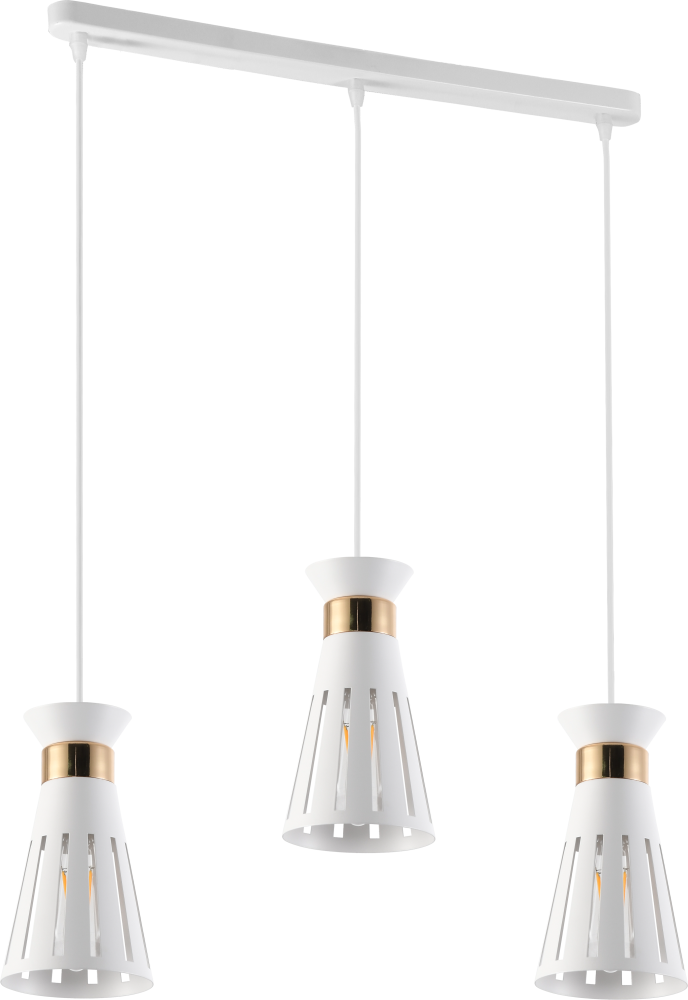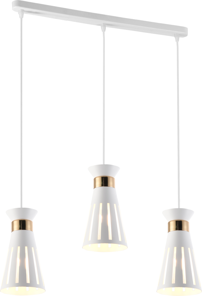Серия металлических подвесов в цвете белый + золото с перфорированными плафонами — стильный выбор для интерьеров в стиле лофт и современного минимализма. Доступны модели на 1 и 3 лампы с цоколем E27 (макс. мощность — 60 Вт, лампы не входят в комплект). Регулируемая высота подвеса позволяет легко адаптировать светильники под особенности помещения.