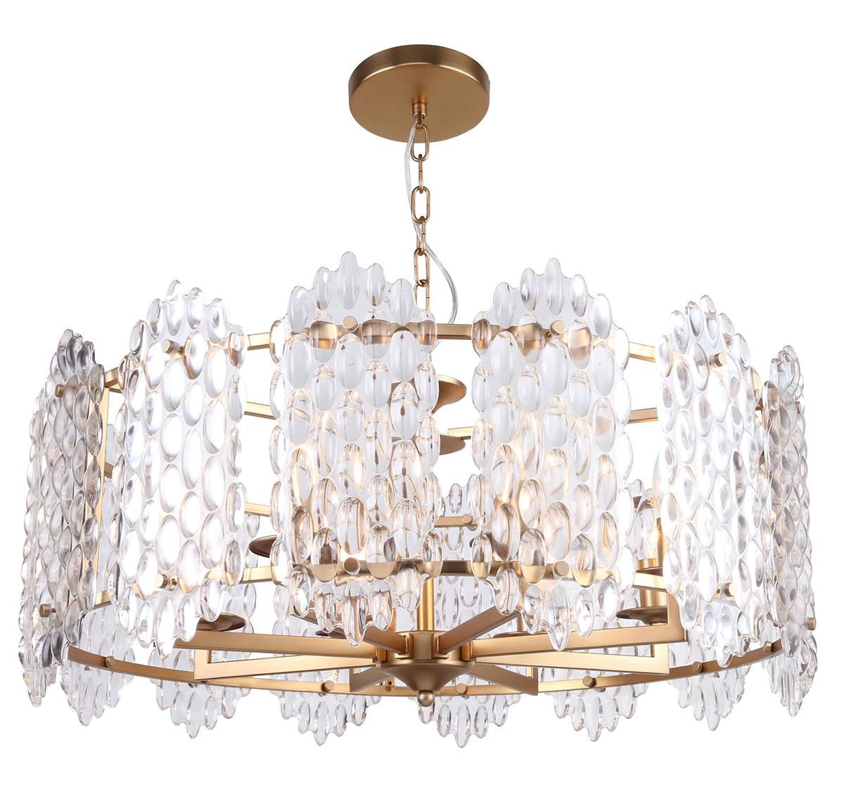 Люстра подвесная из коллекции Glazgo / Глазго выполнена из металла, окрашенного в цвет бронзы, и декорирована вертикальными прозрачными фактурными стеклами.