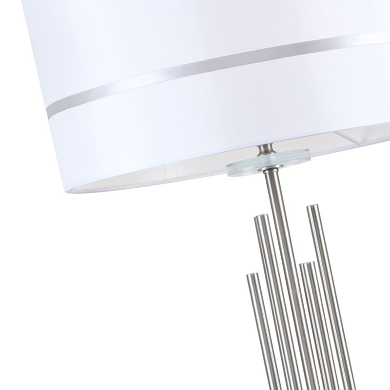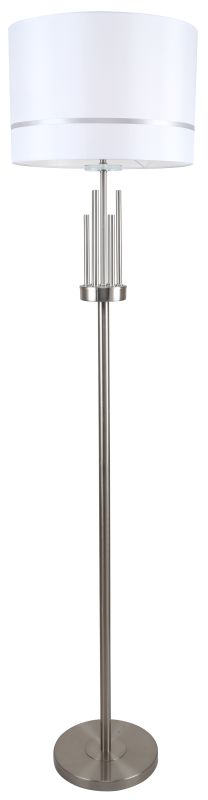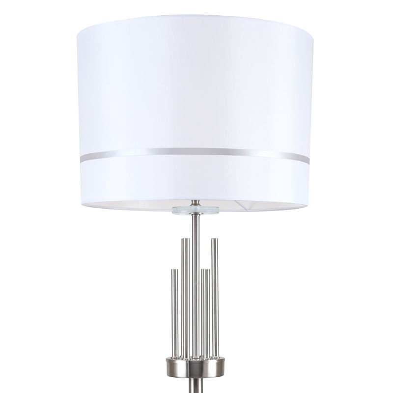 Торшер из коллекции Chart / Чарт выполнен из металла, гальванизированного в цвет никеля, и декорирован железными стержнями в цвет арматуры. Текстильный абажур белого цвета с термостойким акрилом внутри отделан кантом в цвет арматуры. Декоративная розетка выполнена из прозрачного стекла.