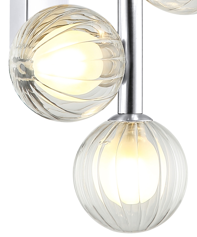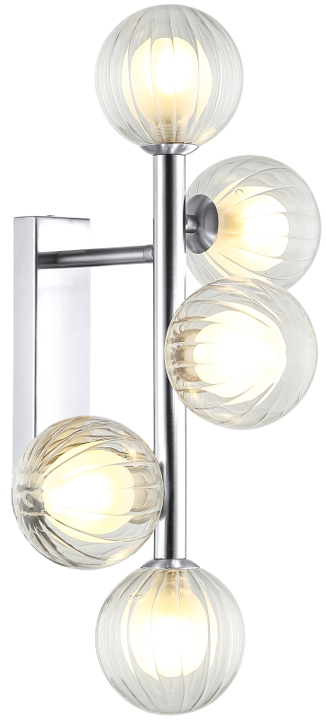 Светильник настенный из коллекции Shardin / Шардин выполнен из металла, гальванизированного в цвет хрома, и декорирован двойными плафонами из прозрачного внешнего стекла с линейным рисунком и внутреннего белого матового.