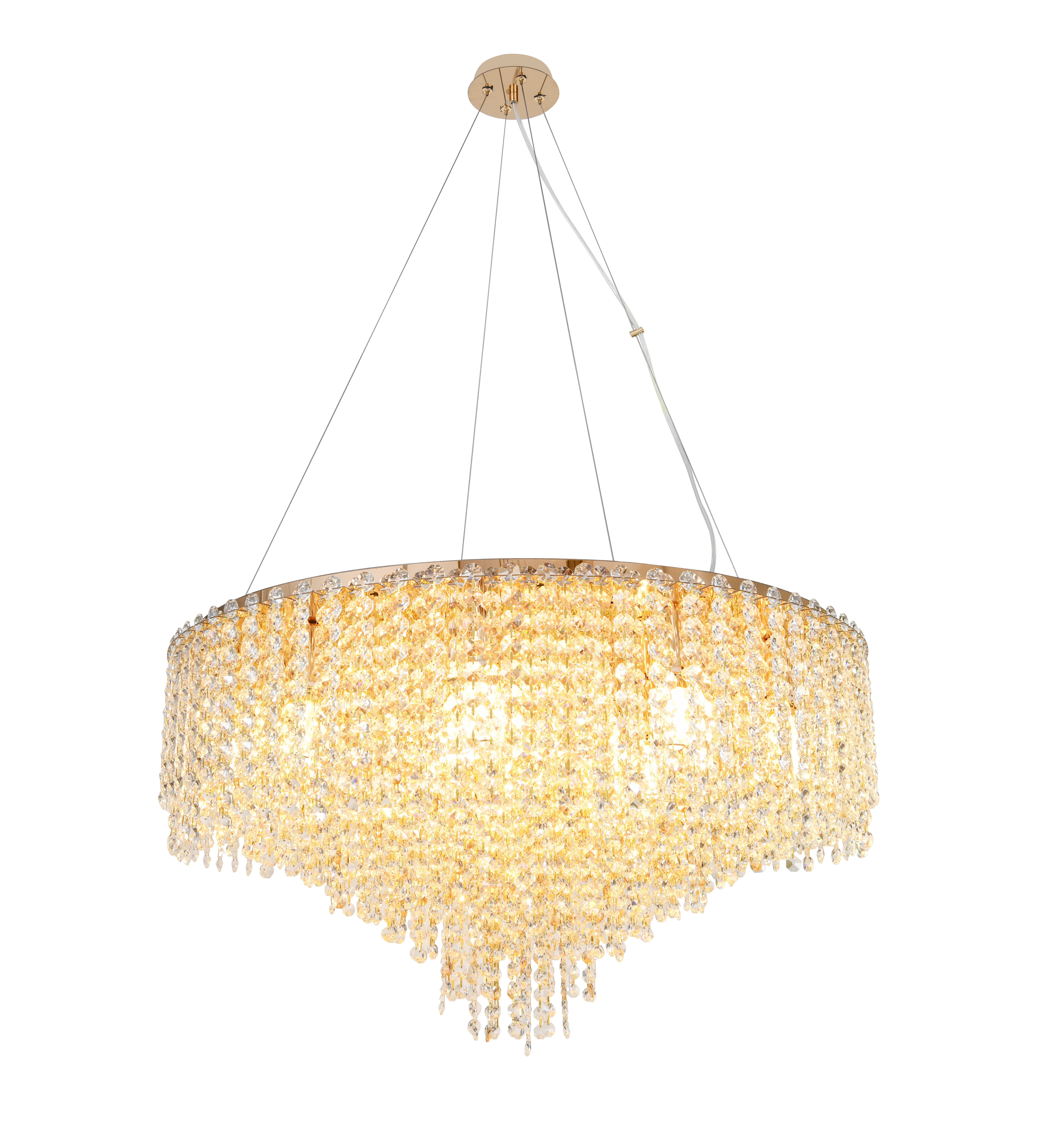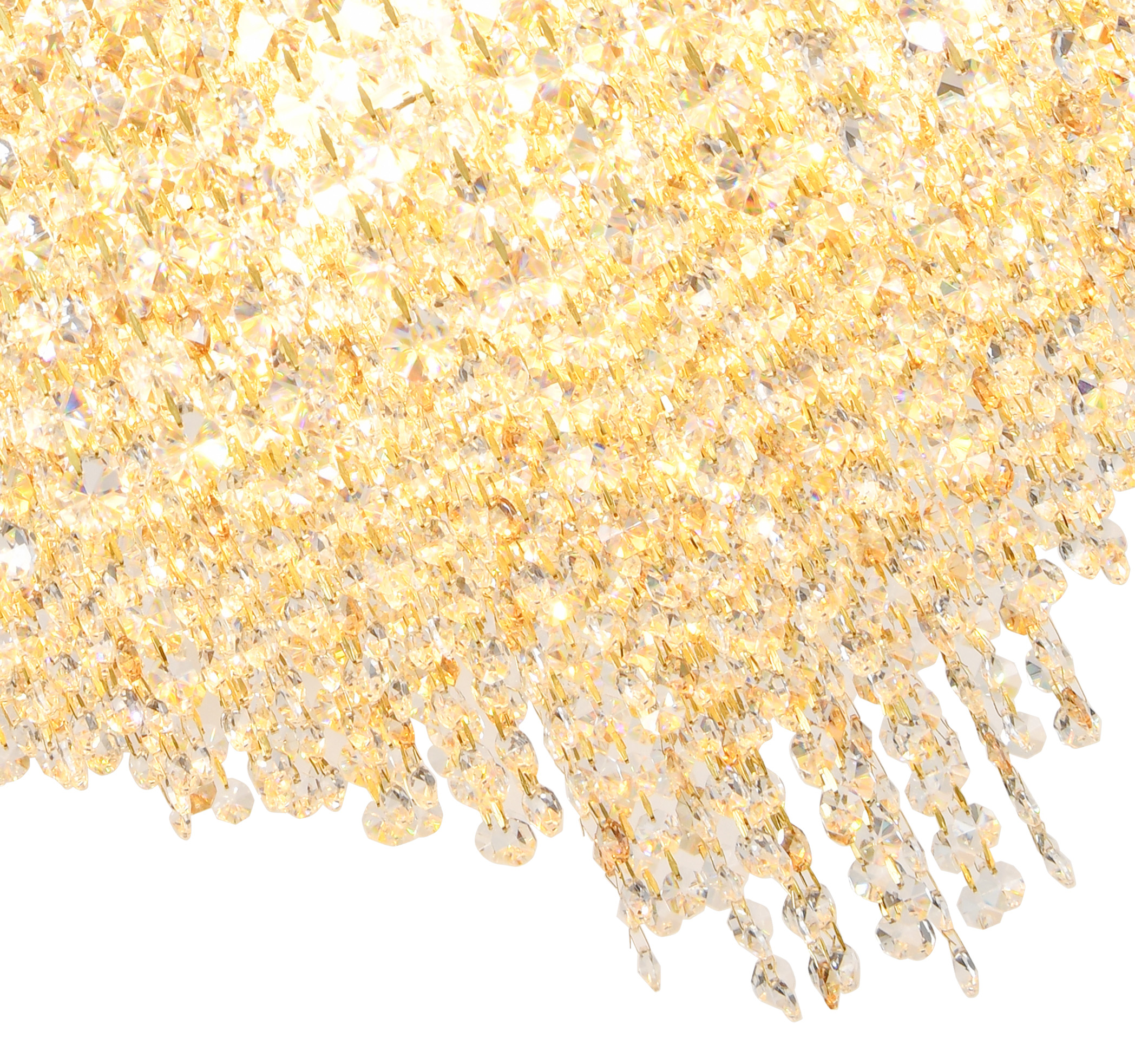 Люстра подвесная коллекции Rain of Crystal / Рейн оф Кристал выполнена из металла, гальванизированного в цвет золота, и декорирована прозрачным и янтарным хрусталем. Особенностью данной коллекции является возможность использовать её как в подвесном, так и в потолочном варианте. На верхней части люстры установлен декоративный лист из нержавеющей стали, отполированный до зеркального блеска, который скрывает технические элементы и позволяет устанавливать её в лестничных проёмах и помещениях со вторым светом. Высокое качество и неповторимый дизайн светильника идеально подойдут как для классических, так и для современных интерьеров. Из данной коллекции светильников можно сделать индивидуальный заказ любого цвета и размера.