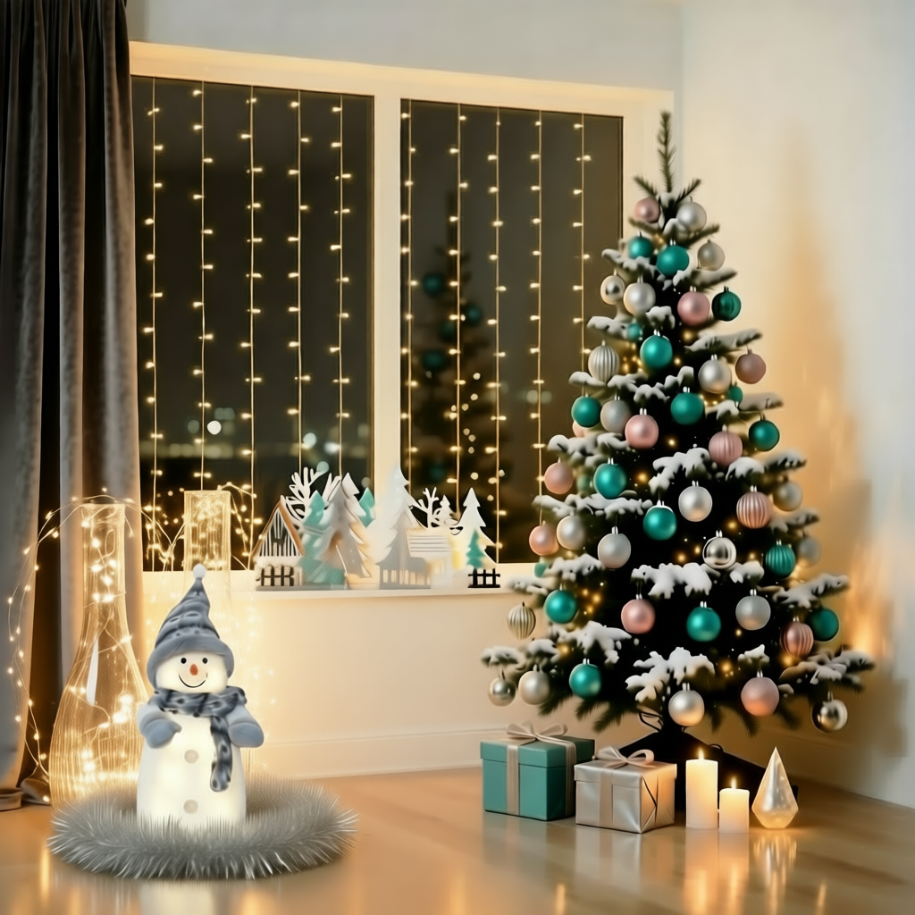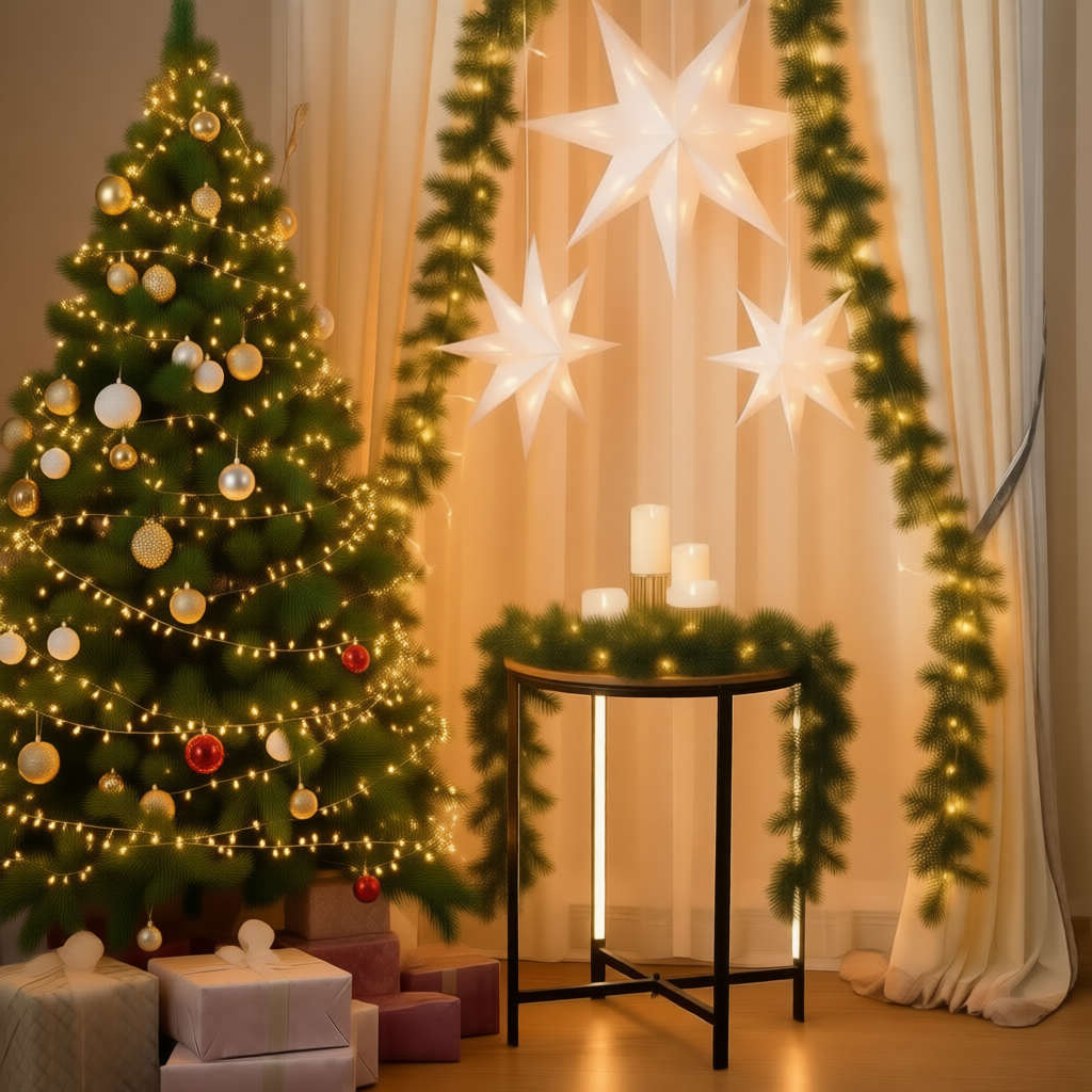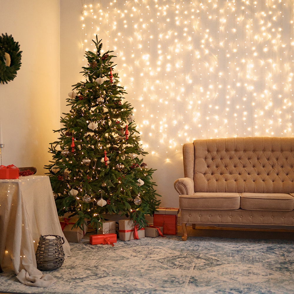 ✅Создайте эффектный фон. Варианты исполнения: гирлянда-занавес с тёплым светом; натуральная композиция с еловыми ветками, шишками и игрушками; фон из ткани в праздничных цветах.