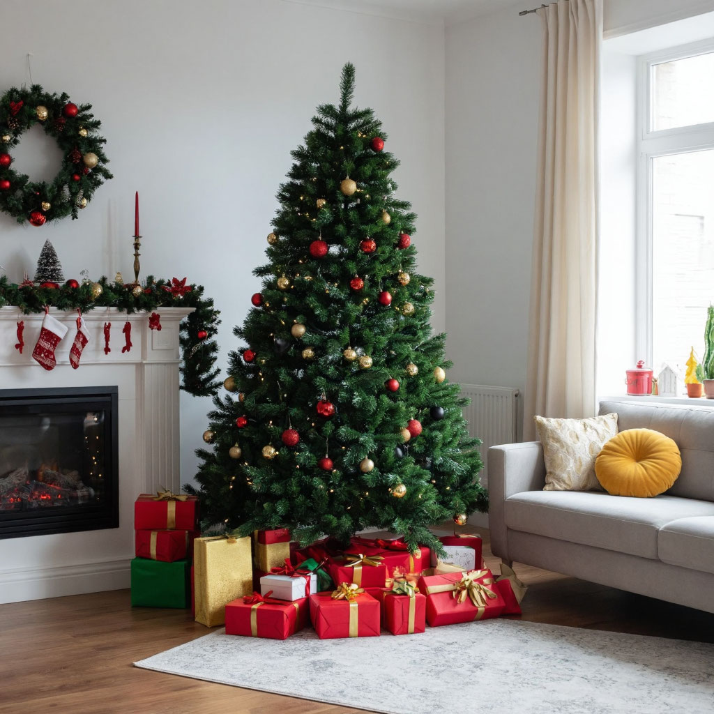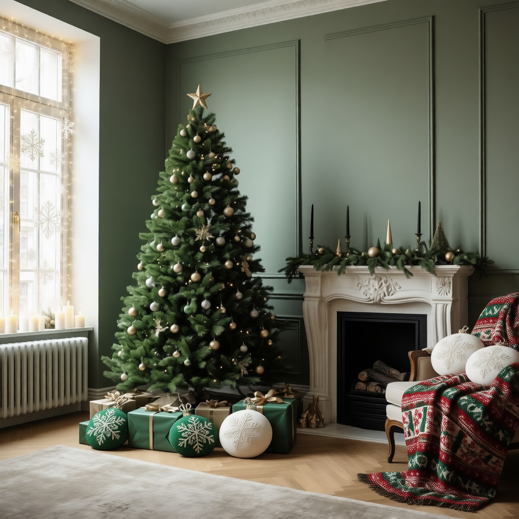 ✅Добавьте объёмные акценты. Для глубины кадра разместите: напольные новогодние фигуры; корзины с подарками; ветки в высоких вазах.